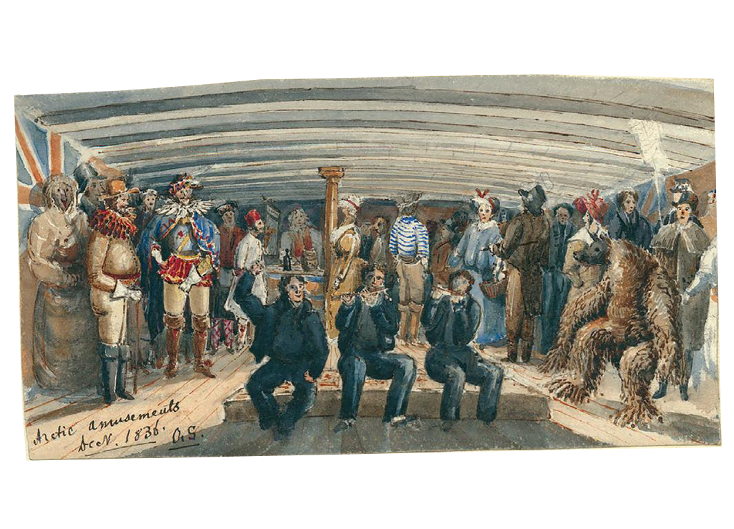 Aboard the ships Erebus and Terror, like other long voyages of the time, the men entertained themselves by putting on theatrical productions, going as far as writing to local theater companies for donations of costumes. Created with onboard printing presses, playbills confirm the existence of the Royal Arctic Theatre.